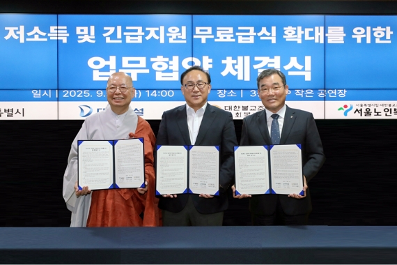 대우건설은 서울시, 조계종 사회복지재단과 함께 저소득 및 긴급 지원이 필요한 어르신들을 위한 서울노인복지센터 무료급식 지원 사업 확대 업무협약을 체결했습니다.