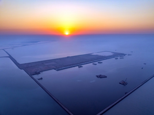 <대우건설이 시공하고 있는 이라크 알포 신항만 컨테이너터미널 안벽공사 현장 전경>