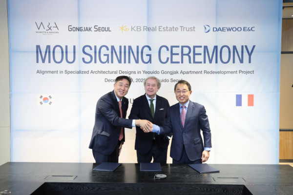대우건설(대표이사 김보현)이 월드클래스 설계사인 프랑스 빌모트(WILMOTTE)사, 공작아파트 재건축 운영위원회(위원장 김철훈)와 손잡고 ‘여의도 공작아파트 재건축사업’의 외관 특화 디자인을 위해 본격적인 협업에 나선다고 22일 밝혔다. 지난 19일(금) 여의도 파크원 타워에서 이와 같은 업무협약을 체결하고, 글로벌 수준의 도시경관과 조화를 이루는 프리미엄 디자인 전략을 공동으로 추진하기로 했다.