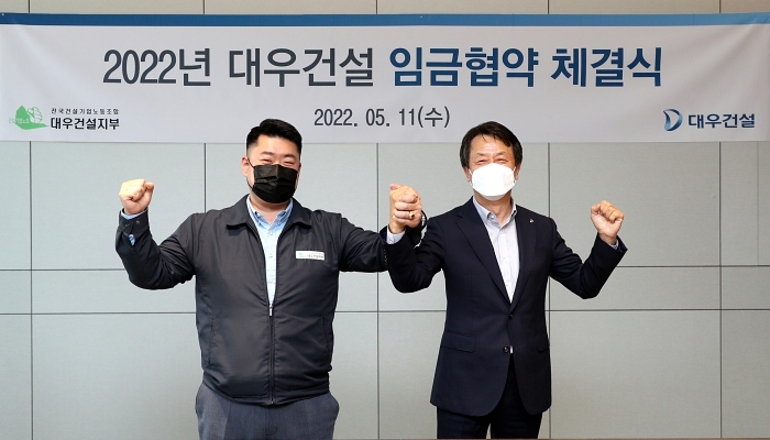대우건설, 올해 두 자릿수 임금인상률 합의 대졸 신입 초봉 5천만원 넘어서 • 평균 10% 인상, 창사 이래 첫 두 자릿수 임금인상률 기록 • 중흥그룹이 인수단계서 노동조합과 체결한 상생협약서에 명시된 ‘3년 내 동종업계 Top3 수준 처우개선 약속’ 이행 의지 확인 • 교섭 한 달 만에 이례적 조기타결로 중흥그룹 인수 후 빠른 조직 안정화 기대 • 현장 중심 경영에 방점...국내외 현장수당 인상, 현장근무자 인사평가 및 승진 우대 [임금협약 체결식 사진] 백정완 대우건설 대표이사(오른쪽)와 심상철 노동조합 위원장
