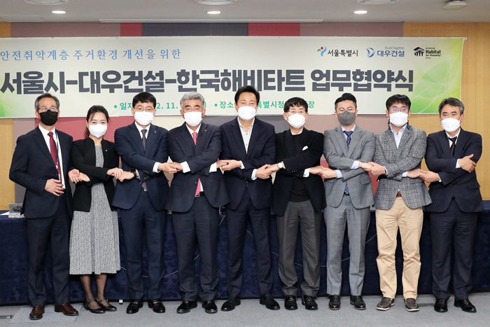 대우건설은 금일(11월 14일) 서울특별시, 한국해비타트와 주거안전 취약계층의 주거환경 개선을 위한 업무 협약을 체결하였다고 밝혔다.
